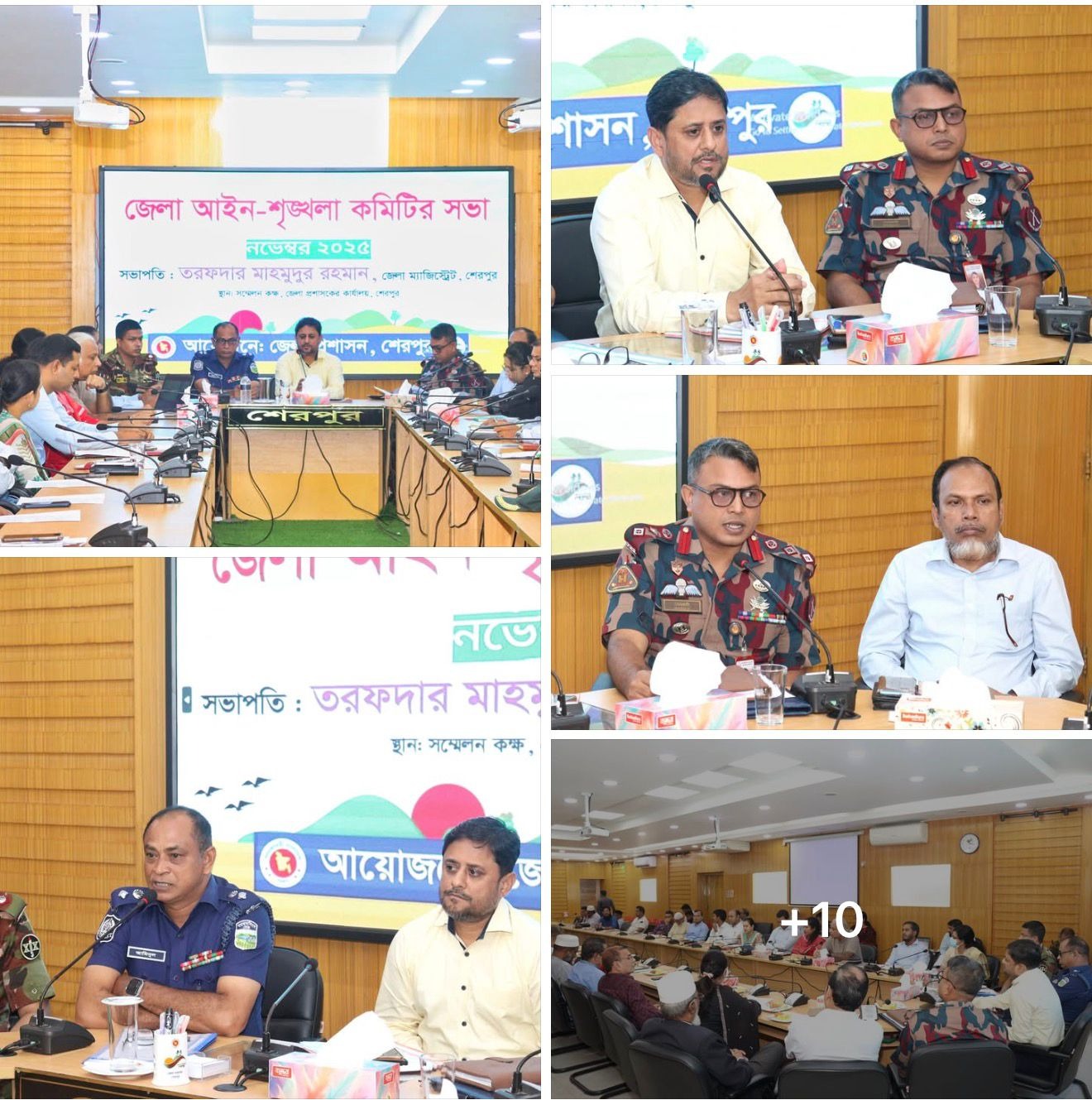 শেরপুর জেলা আইন-শৃঙ্খলা কমিটির নভেম্বর-২০২৫ মাসের মাসিক সভা জেলা প্রশাসকের কার্যালয়ের সম্মেলন কক্ষে অনুষ্ঠিত হয়েছে। রবিবার (০৯ নভেম্বর) সকাল ১০:৩০টায়